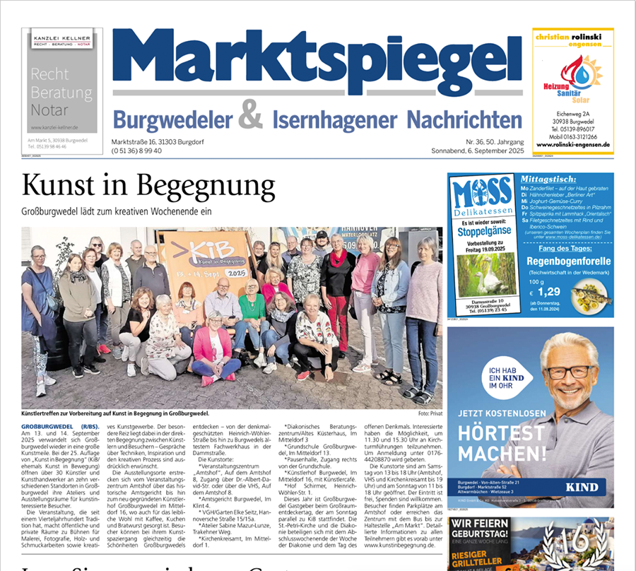 Am 13.09. und 14.09 2025 “Kunst in Begegnung“ Über 30 Kunstschaffende zeigen an diesem Wochenende Ihre Werke.